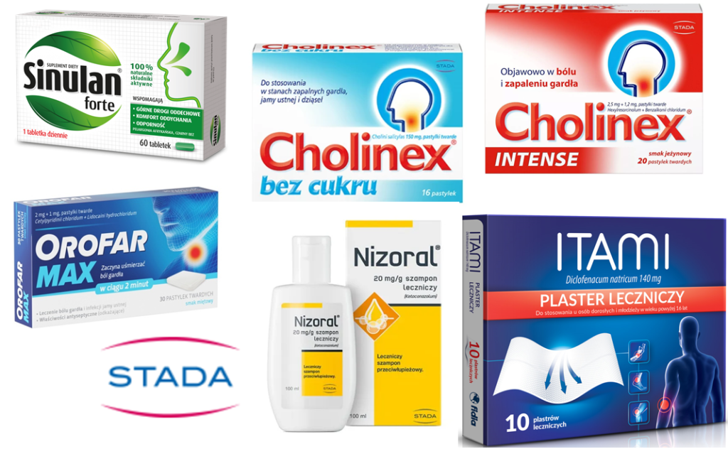 W ofercie firma Stada znajdą Państwo lek Cholinex i Cholinex Intense dla dorosłych, a także Orofar Max idealne produkty na ból gardła oraz stany zapalne jamy ustnej. Można znaleźć również Sinulan, produkt stosowany w infekcjach górnych dróg oddechowych, plastry Itami na bóle mięśni i stawów oraz szampon Nizoral zwalczający łupież.