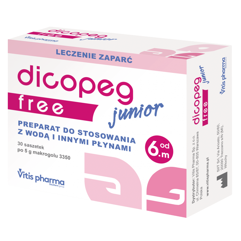 Dicopeg Junior Free to proszek do sporządzania roztworu doustnego, w celu leczenia przewlekłych zaparć lub zaburzeń pracy jelit. Proszek Dicopeg Junior Free zmiękcza stolec, ułatwiając wypróżnianie, nie powodując przy tym skurczów, bólów brzucha ani nagłego parcia. Co ważne jest to bezpieczny i skuteczny produkt, dlatego może być stosowany nawet dla niemowląt od 6. miesiąca życia i starszych dzieci.