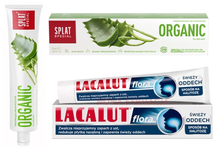 •        czyste zęby, zatem należy wybierać odpowiednią pastę do zębów. Przede wszystkim należy zadbać o to by oczyszczała, polerowała i wygładza płytkę nazębną, działała wybielająco, a także chroniła przed próchnic. Można zatem sięgnąć po: Splat Special Organic Pasta do zębów, która ma działanie wzmacniające, została stworzona do pielęgnacji bardzo wrażliwych zębów. Ale także dobrym rozwiązaniem będzie Pasta do zębów LACALUT FLORA, która myję, czyści i pielęgnuje zęby oraz dziąsła, a także neutralizuje nieprzyjemny zapach z ust.