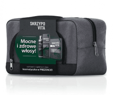 •        Zestaw Skrzypovita PRO MEN –składa się z szamponu, suplementu diety w tabletkach, które umieszczone są w eleganckiej kosmetyczce od firmy Zdrovit. Produkty te są idealne do codziennej higieny i pielęgnacji włosów mężczyzn, a także ich wsparcia. Składniki zawarte w tych produktach wzmacniają włosy i ograniczają ich wypadanie. To elegancki prezent, dla mężczyzny w każdym wieku.