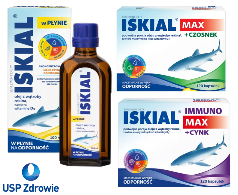 Iskial to kompleksowa formuła, która łączy w sobie olej z wątroby rekina i witaminę D3. Natomiast Iskial Max zawiera w sobie maksymalną zawartośćsobie olej z wątroby rekina i  witaminę D3.