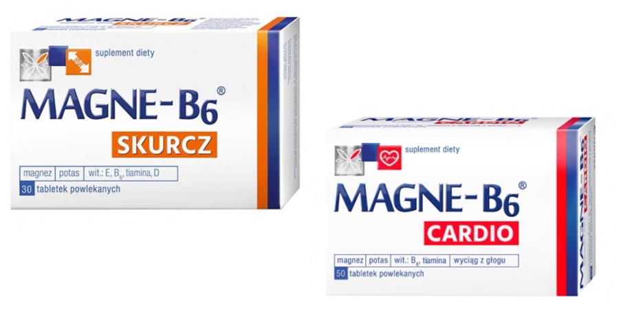 - Magne B6 Skurcz -wzbogacony o potas i witaminy: D, B1, E i B6. Przeznaczony jest do wspomagania pracy mieśni i utrzymanie prawidłowego metabolizmu energetycznego, wsparcia zachowanie równowagi elektrolitowej oraz zmniejszenia uczucia zmęczenia i znużenia.