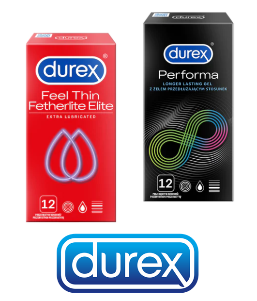 - Durex Performa – to prezerwatywy, które przedłużają stosunek. Zawierają one w sobie benzokainę, specjalny płyn umieszczony w końcowej części prezerwatywy, który pozwala na opóźnienie wytrysku.