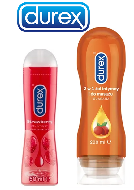 - Durex Play – to żel intymny o smaku słodkiej truskawki. Jest to wyjątkowo zmysłowy sposób na urozmaicenie życia intymnego. Przeznaczony dla kobiet i dla mężczyzn.