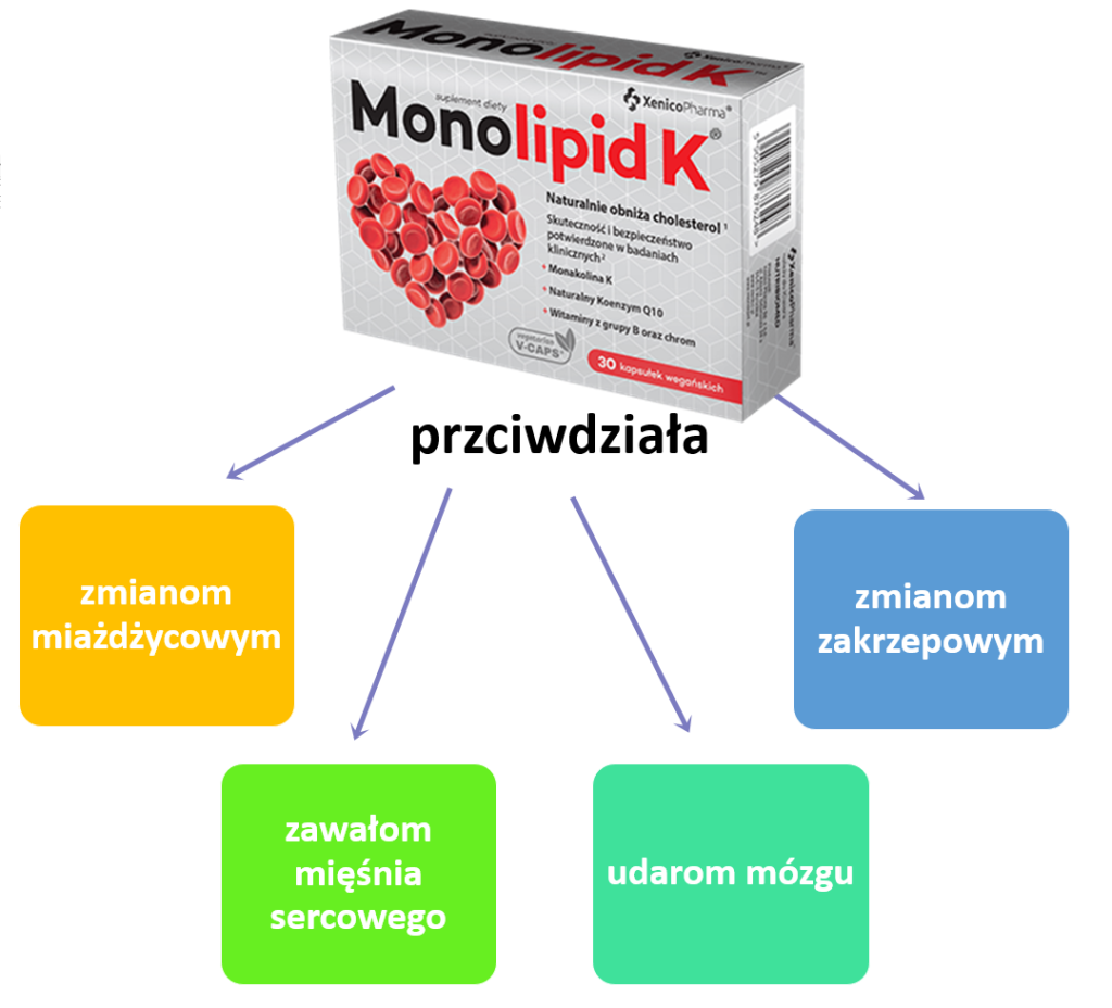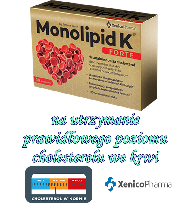 Dlatego suplement diety Monolipid K Forte działa wspomagająco na w utrzymaniu prawidłowego cholesterolu w organizmie.