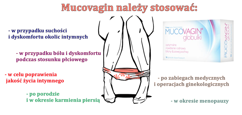 Wyrób medyczny Mucovagin stosuje się dopochwowo w celu łagodzenia objawów takich jak suchość i dyskomfort. Zalecany jest szczególnie: