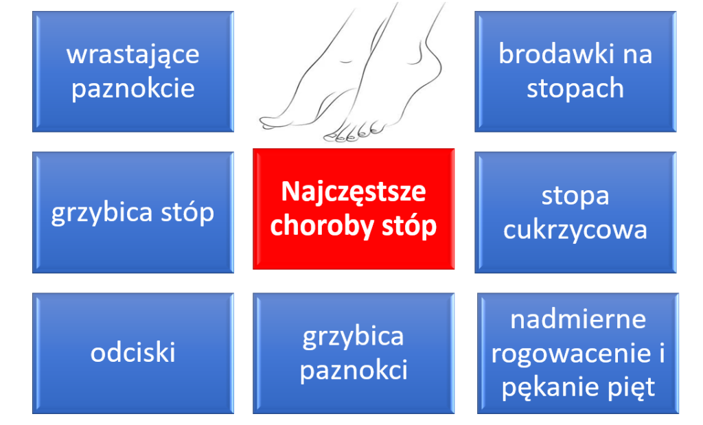 Choroby stóp mogą mieć różną etiologię. Niektóre są efektem bezpośredniego kontaktu z patogenem, inne powstają wskutek zmian cywilizacyjnych, natomiast pozostałe towarzyszą chorobom ogólnoustrojowym organizmu. Do najczęstszych choroby stóp możemy zaliczyć: