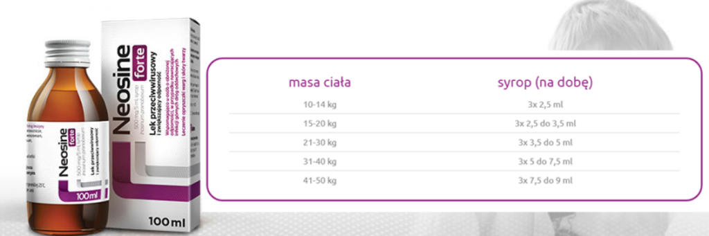 Neosine Forte jest również dostępne jest w formie tabletek i syropu. Tutaj zastosowano dawkę 100 mg dla tabletek i 500 mg dla 5 ml syropu.