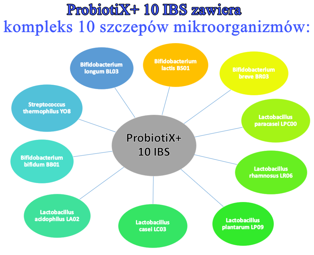 ProbiotiX+ 10 IBS to najwyższej jakości nowoczesny probiotyk, który zawiera w sobie aż 10 szczepów żywych kultur bakterii w ilości aż 8 miliardów w porcji dziennej. Jego działanie zostało udowodnione w wielu badaniach klinicznych, dlatego jest bezpieczny do stosowania.