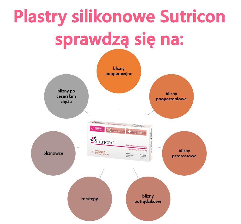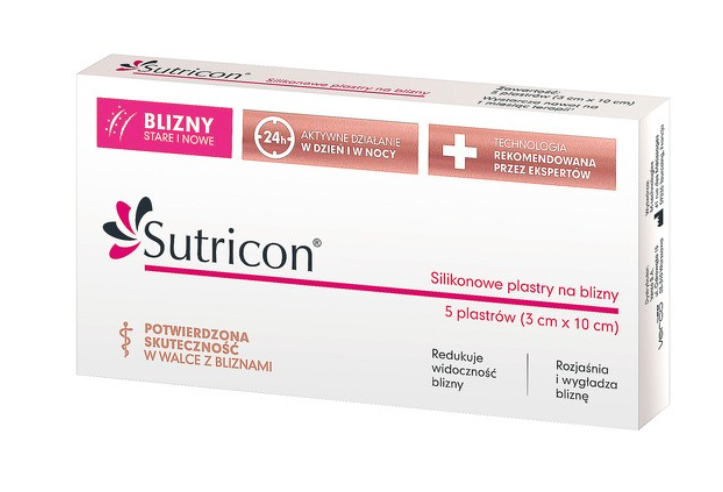 Plastry silikonowe Sutricon redukują dyskomfort w postaci bólu i swędzenia skóry, a także łagodzą uczucie ciągnięcia skóry. Przy regularnym ich stosowaniu można spodziewać się poprawy wyglądu zarówno świeżych jak i starych blizn. Dzięki plastrom Sutricon będzie można szybko pozbyć się pozbyć się nieestetycznych zmian i blizn.