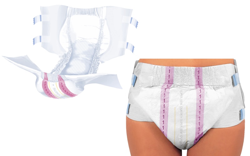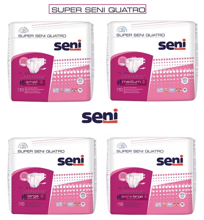 Super Seni Quatro mogą być stosowane przy inkontynencji moczowej oraz kałowej. Na produktach zamieszczony jest podwójny indykator wilgotności, który precyzyjnie informuje o stopniu napełnienia bielizny chłonnej, a także konieczności jej wymiany. Podobnie jak w pozostałych pieluchomajtach Seni, należy kierować się tym jaki rozmiar tradycyjnej bielizny nosimy na co dzień, gdyż powyższe produkty odpowiadają bieliźnie w rozmiarach od S do XL, lub zamieszczonym na produktach parametrom i tak: