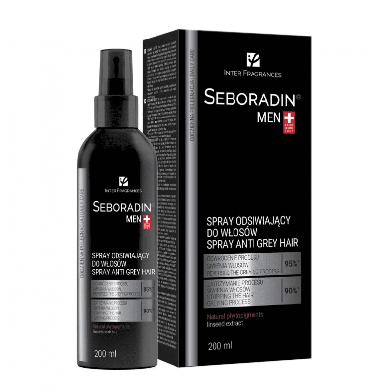 Badania potwierdziły, że regularne stosowanieodsiwiającego sprayu Seboradin Men do włosów redukuje ilość siwych włosów oraz wzmacnia naturalny kolor włosów, gdyż ten spray nie jest produktem koloryzującym włosy.