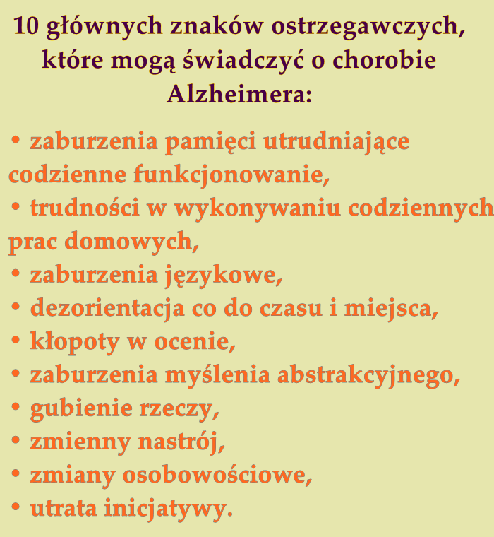 Osoby chore zaczynają zapominać podstawowe rzeczy związane z pracą zawodową czy czynnościami dnia codziennego, zapominają słowa, imiona, gubią się w znanych ich miejscach. Z czasem chory przestaje rozpoznawać bliskich, nie potrafi określić, w jakim jest miejscu, nie może wykonać żadnej czynności samodzielnie, nie panuje nad czynnościami fizjologicznym. Gdy zauważysz podobne objawy u siebie lub u bliskiej osoby skontaktuj się z lekarzem.