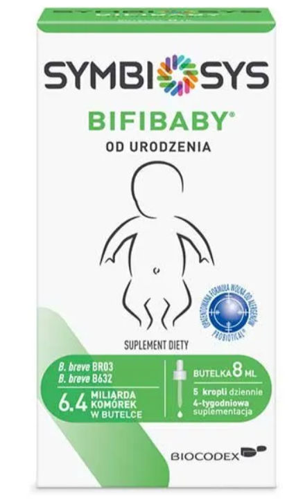 Symbiosys Bifibaby to probiotyk, który wspomaga utrzymanie prawidłowej mikroflory przewodu pokarmowego oraz wspiera odporność dziecka.