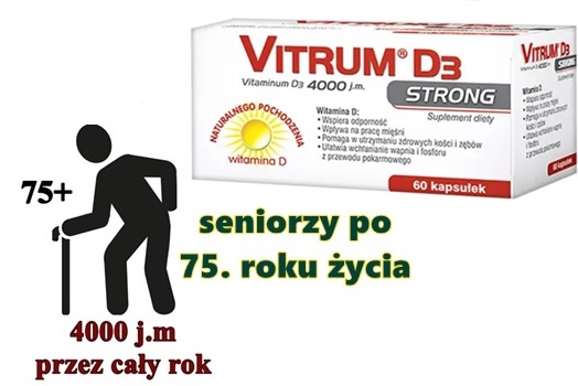 Zapotrzebowanie na witaminę D3, u osób starszych jest ogromne i należy dostarczać do organizmu odpowiedną dzienną porcję. Po ukończeniu 75 roku życia zauważalna jest zmniejszona skuteczność syntezy skórnej oraz obniżona absorpcja z przewodu pokarmowego, dlatego dzienne dawka witaminy D3 wynosi od 2000 do 4000 jednostek na dobę. Przez osoby starsze Vitrum D3 Strong musi być zażywane przez cały rok.