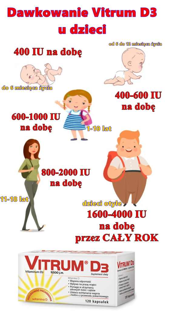 - natomiast dzieci zmagające się z otyłością powinny zażywać witaminę D3 w dawce od 1600 aż do 4000 j.m. na dobę i musi być ona zażywana podawana przez cały rok.