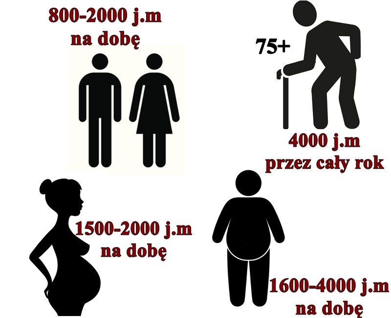 •        u kobiety w ciąży i karmiącej 1500-2000 j.m. na dobę,